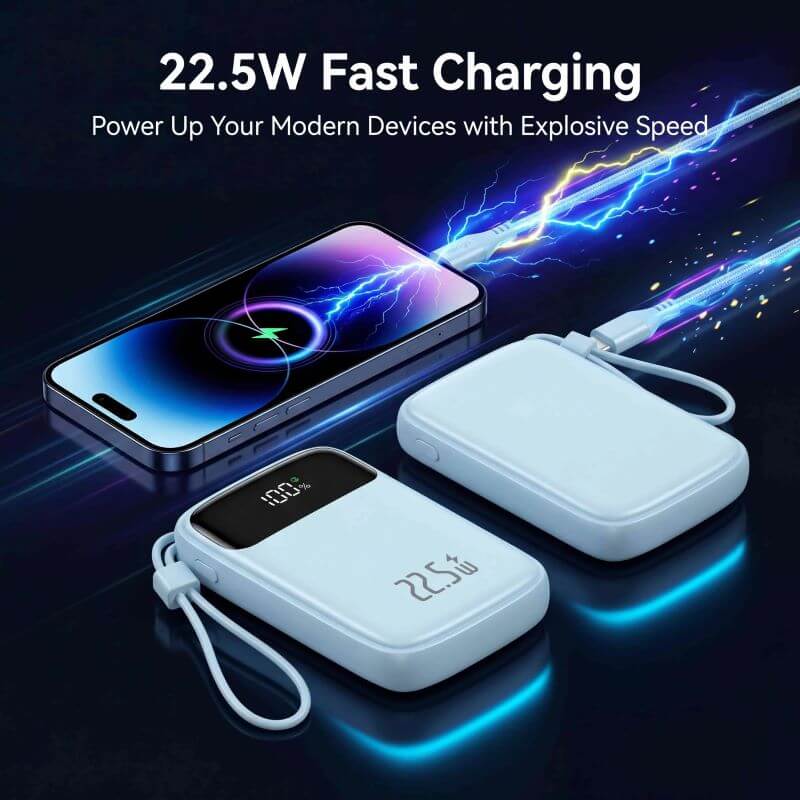 It features 22.5W fast charging, convenient built-in cables, and a smart digital display for accurate battery level monitoring.