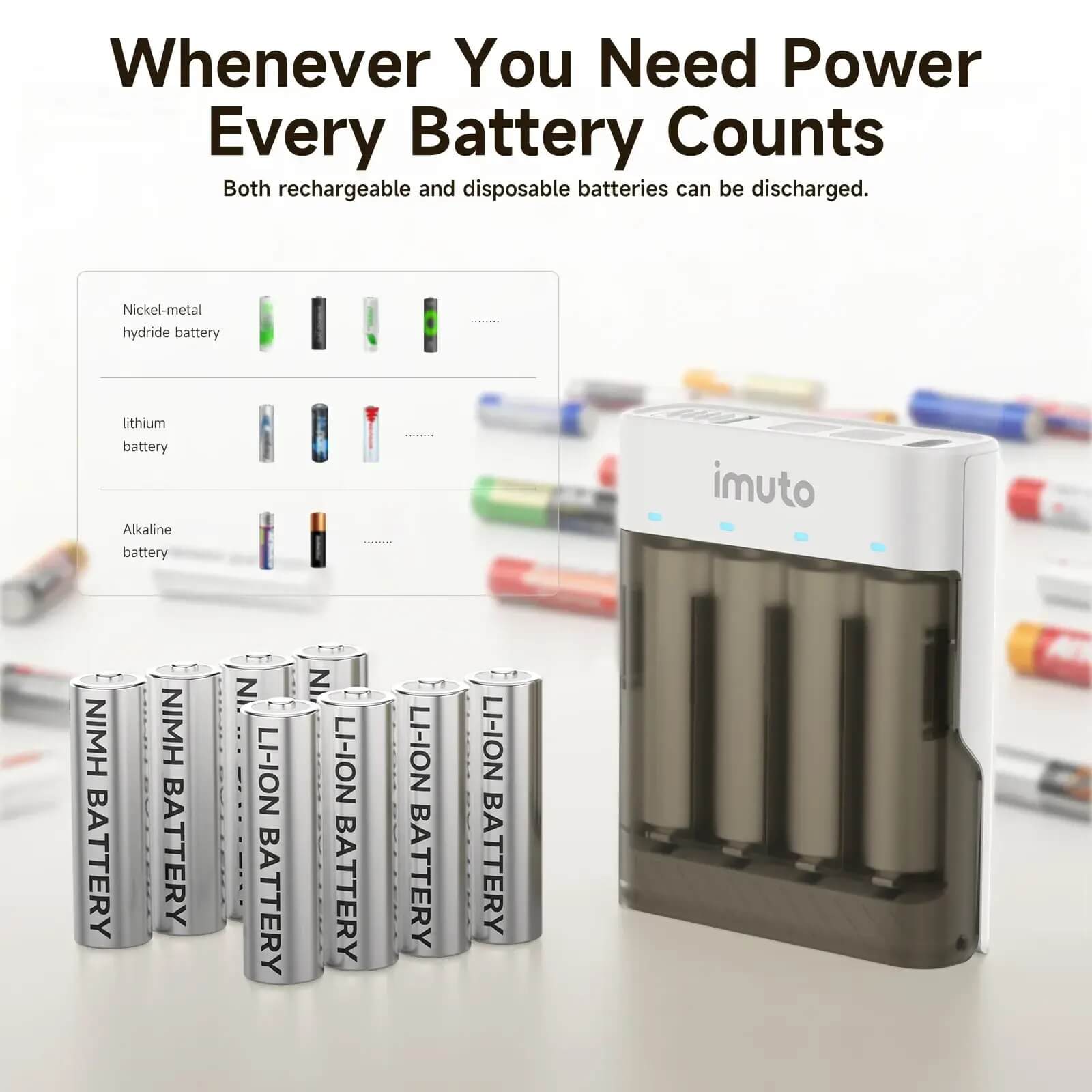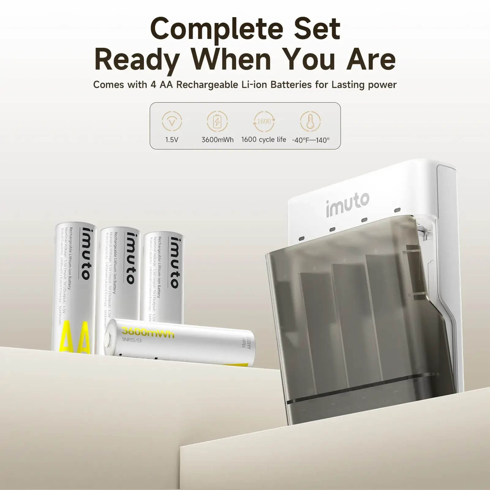 Power your devices with the advanced Imuto 3600mWh AA Rechargeable Battery Kit, designed for performance, reliability, and versatility. This all-in-one solution includes 4 high-capacity lithium batteries and a multifunctional slide power case with USB-C charging and built-in flashlight.