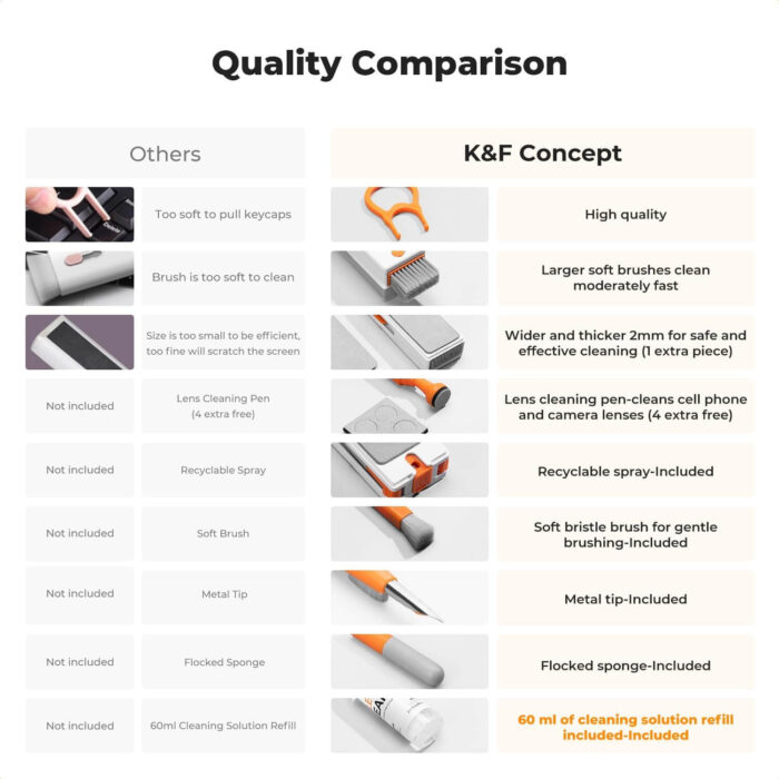 Keep your devices spotless with the K&F CONCEPT 11-in-1 Electronics Cleaning Kit, a versatile and professional solution for all your tech-cleaning needs. Whether you’re tackling dusty keyboards, smudged screens, or headphone cases, this kit has you covered.