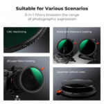 【3 in 1 Filter】 One filter support light reduction, creates dreamy effect and enhance color and contrast of image, widely fit most photography needs, provides more creations for your image. Double-sided 28-layer coatings ensure resistance against water, oil, dust, and scratches, and imported optical AGC glass material delivering crystal-clear results. An 52mm lens cap is required for this 49mm filter.