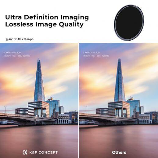 【Premium Quality】 K&F Concept ND1000 Lens Filter is made of high quality optical glass, no colour cast while providing solid 10 f-stop reductions and enabling longer exposures to capture the beauty of time and movement.
