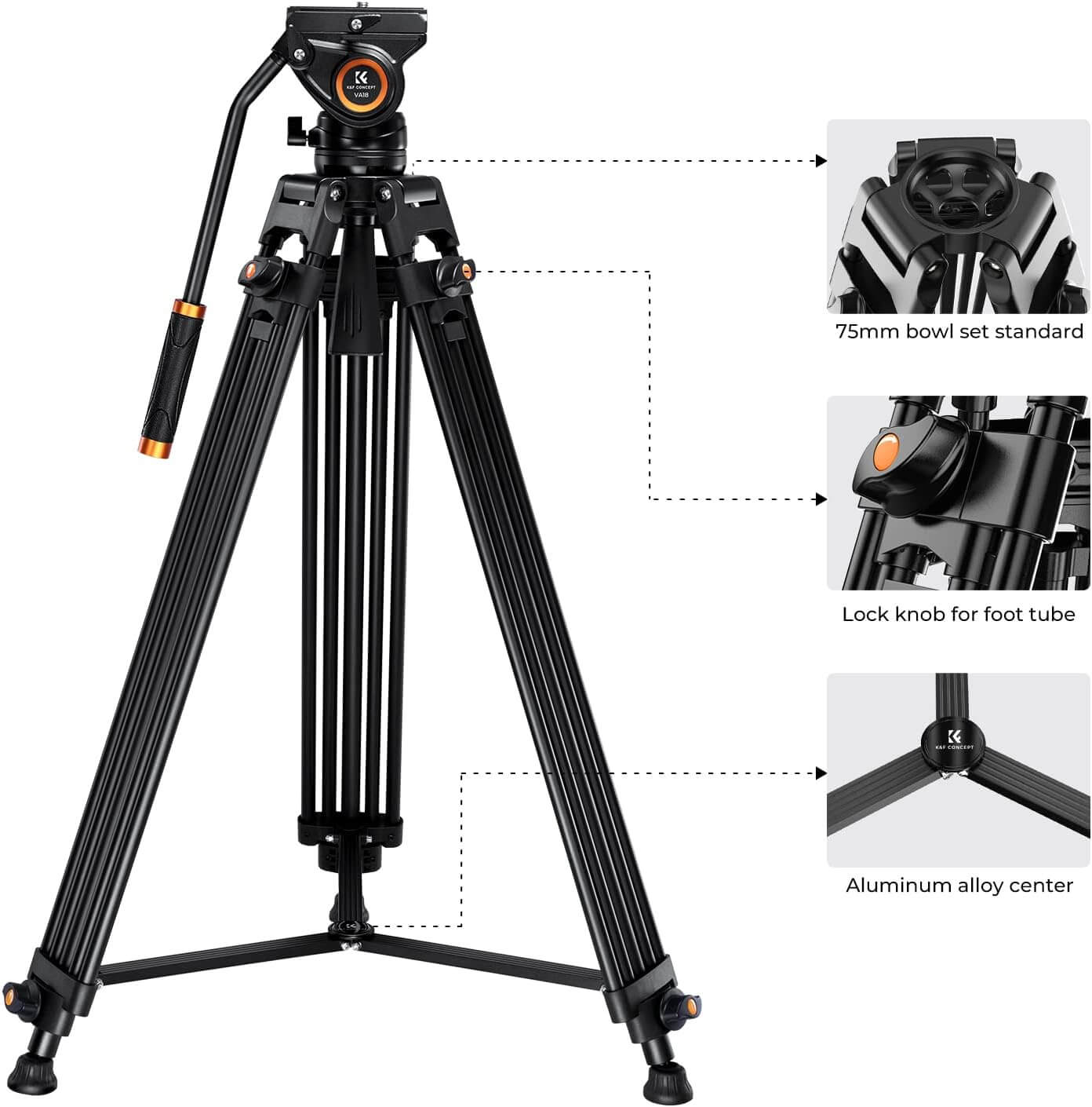 Made of high-strength aluminum alloy, the tripod includes double-row legs, a 75mm bowl base, and non-slip rubber feet for indoor and outdoor use.