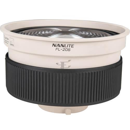 Enhance the output and beam control of your Nanlite lights with the FL-20G Glass Fresnel Lens, designed for Forza 300, 500, 720, FS-Series, and more. Utilizing a standard Bowens S-Type mount, this durable glass Fresnel lens transforms a wide beam into a focusable spot (10°) or flood (45°), making it ideal for precise lighting in film, photography, and broadcast production.