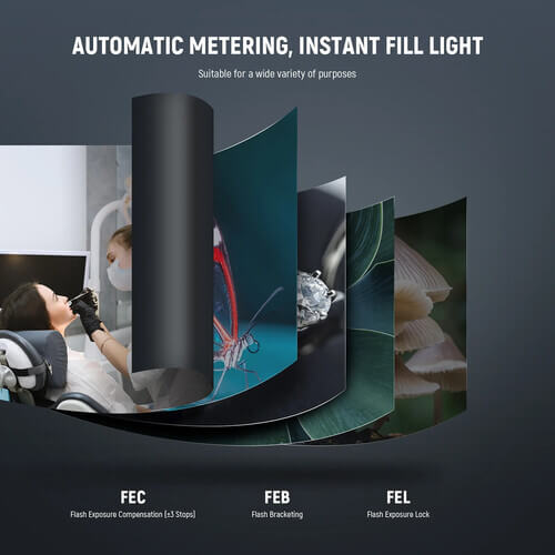 Manual Mode: Adjustable flash power from 1/1 to 1/128