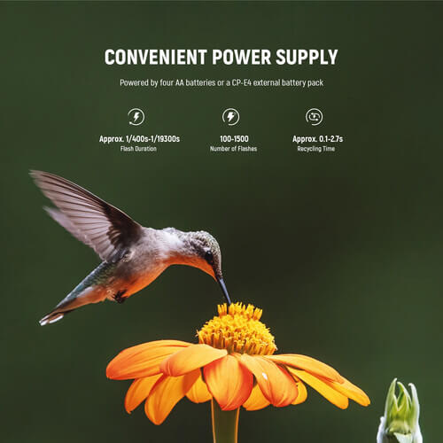 Powered by 4 AA batteries (not included), the RF1-S provides 100 to 1500 flashes per charge with: