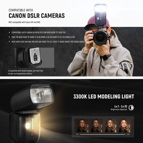 The Neewer Z880 TTL Speedlite Flash is a high-performance camera flash designed to meet the demanding needs of photographers shooting with Nikon, Canon, or Sony cameras. With advanced features like i-TTL/M/RPT modes, high-speed sync up to 1/8000s, and a built-in 2.4G wireless Q system, this flash delivers professional lighting for portrait, event, and location photography.