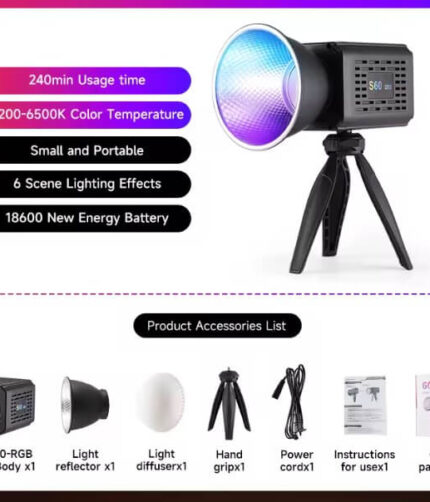 YM-S60 RGB COB Light – 18600mAh Rechargeable LED Video Light with 20 Effects